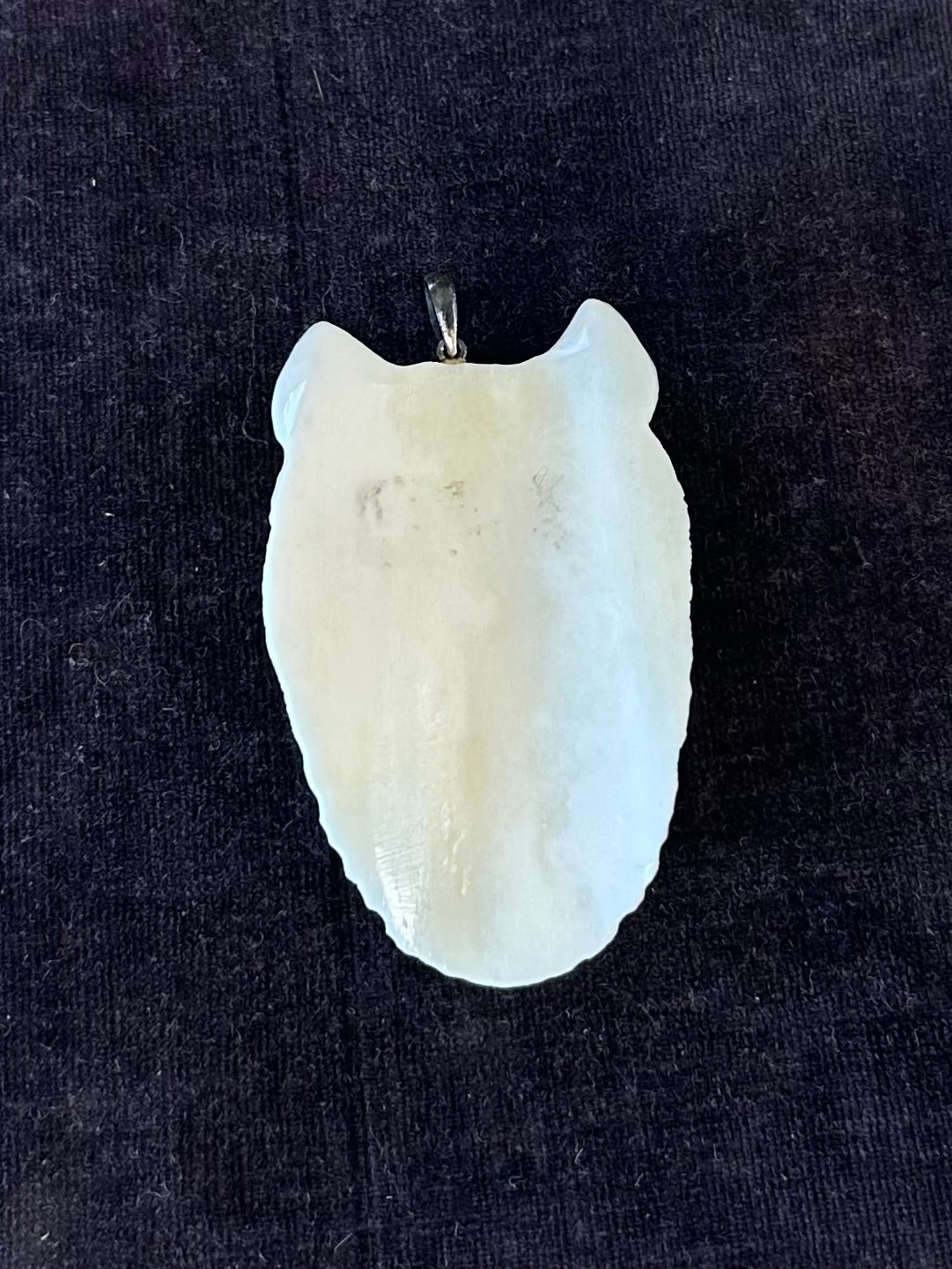 One of a kind handcarved bone wolf face/head pendant. Has a silver tone bail for adding to a chain.