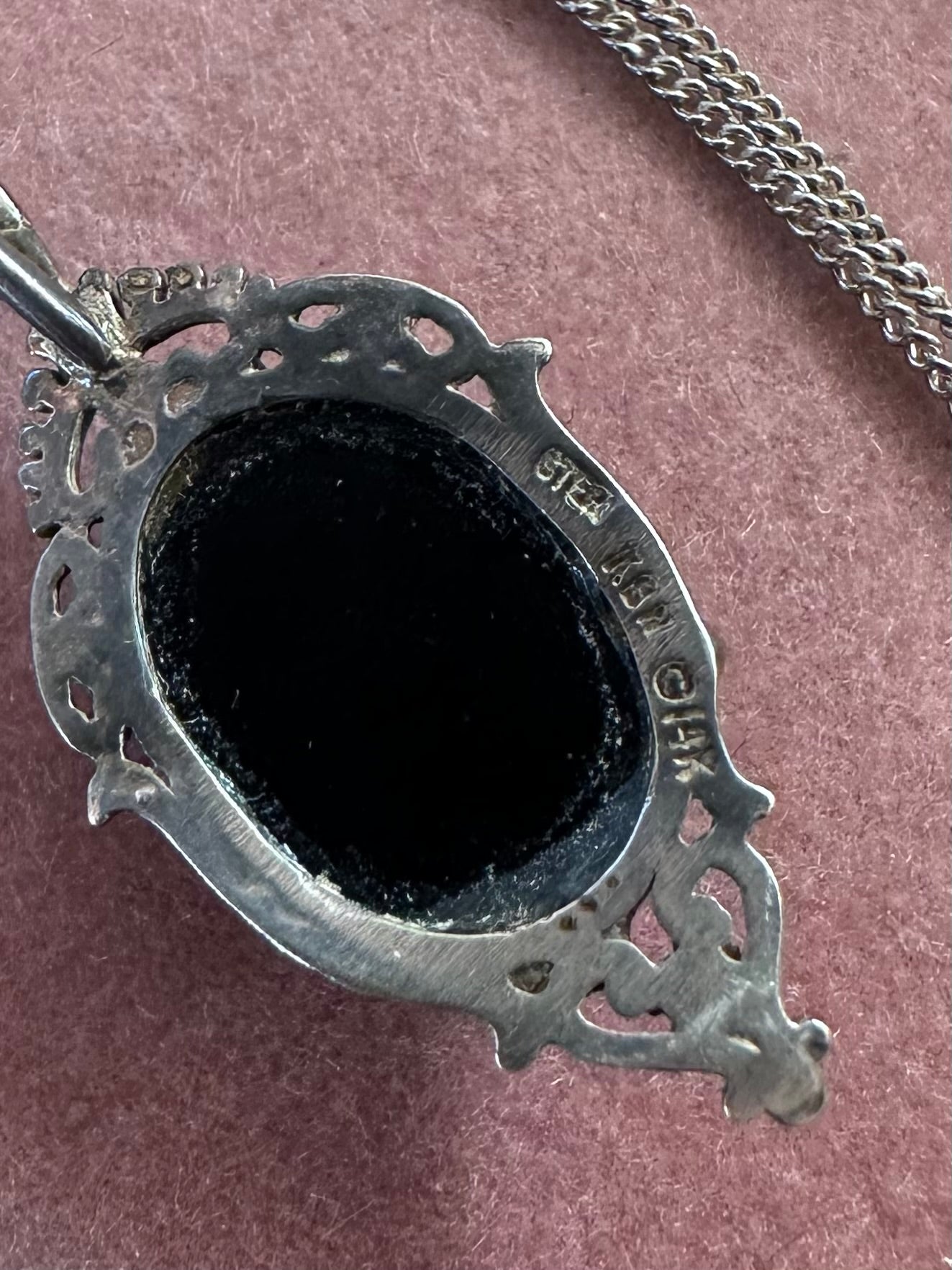 Vintage Signed Kabana KBN Sterling Silver & 14K Black Onyx Pendant Necklace 17”