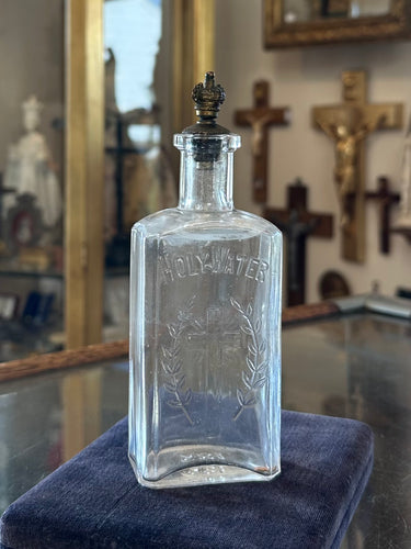 Antique 1910s Edwardian Clear Glass Holy Water Bottle Cross & Leaves with Metal Crown Cap 6” Tall