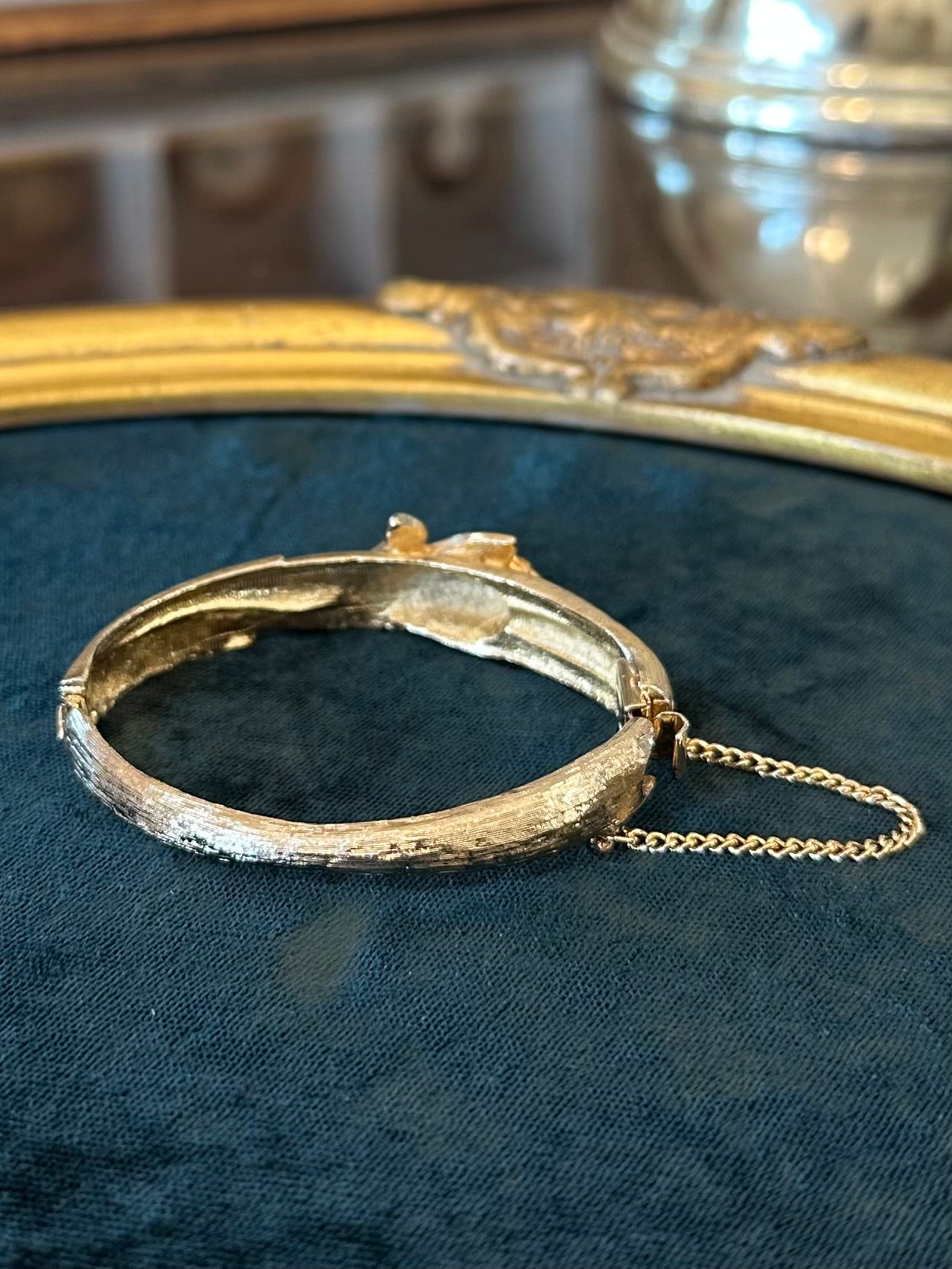 Beautiful textured gold tone hinged bangle bracelet with wave motif design.