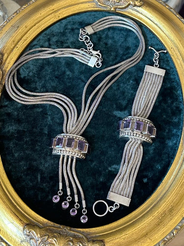 Chunky Sterling Silver & Genuine Amethyst Multi Strand Statement Necklace and Bracelet Set