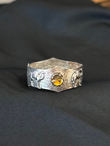 Vintage 1970s Middle Eastern Silver Tone & Yellow Amber Colored Glass Cabochon Camel Motif Hamsa Hand Bangle Bracelet