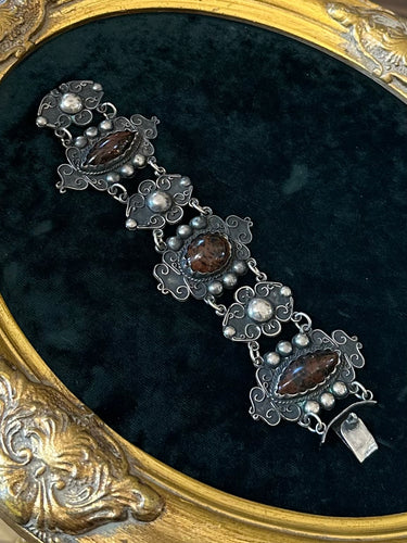 Vintage Mexico Sterling Silver & Dalmatian Jasper Cabochon Ornate Scrollwork Panel Link Statement Bracelet 6.75”