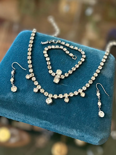Vintage Circa 1950s Faceted Glass Rhinestone Collar Necklace 15”, Bracelet 7.5”, & Dangle Earrings Set