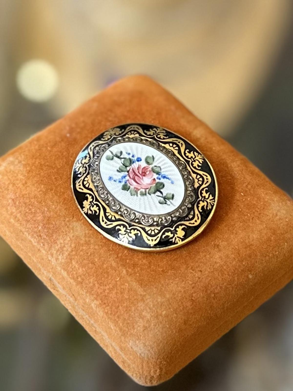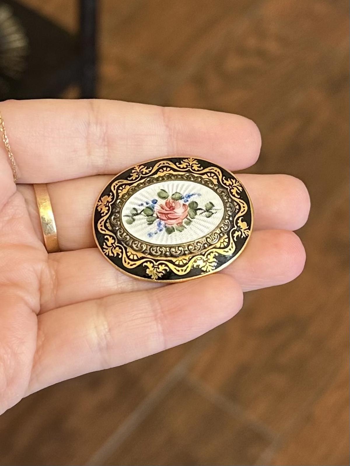 Vintage Oval Guilloche Enamel Handpainted Rose Flower Black Gold Edge Pin Brooch