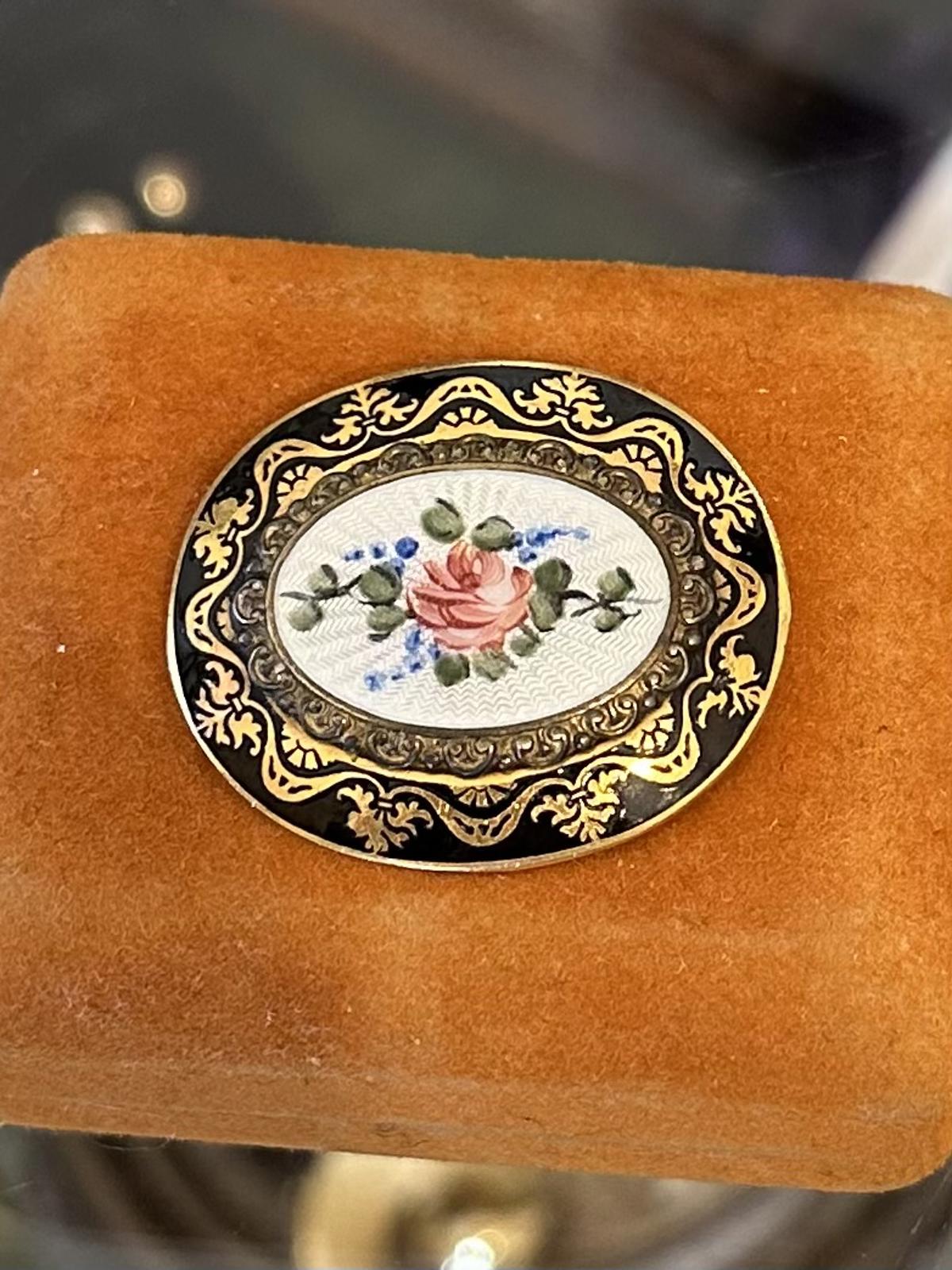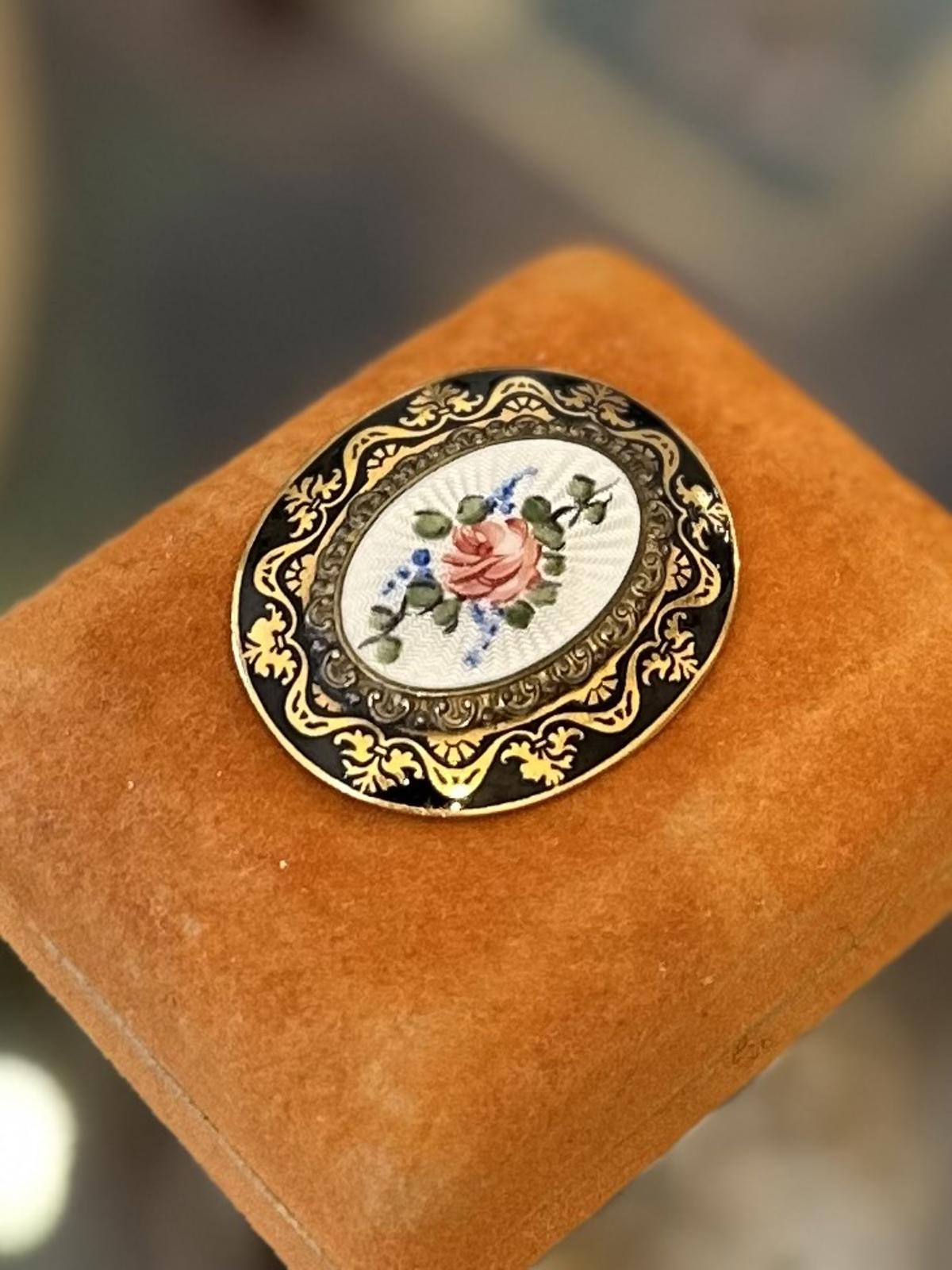 • Load image into Gallery viewer, Vintage Oval Guilloche Enamel Handpainted Rose Flower Black Gold Edge Pin Brooch