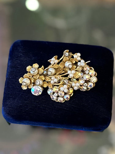 Vintage Early Miriam Haskell Unsigned Faux Pearl Clear & Aurora Borealis Rhinestone Gold Tone Brooch