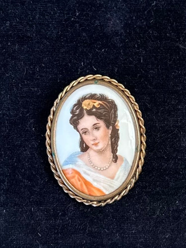 Vintage Signed LIMOGES FRANCE Painted Porcelain Portrait of a Lady Oval Gold Tone Brooch