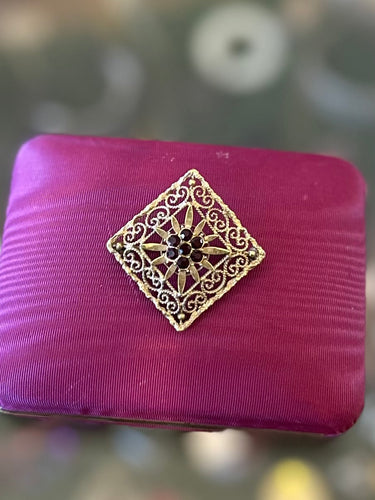 Vintage 1960s Signed Andreas Daub German Rolled Gold & Genuine Garnet Filigree Brooch Midcentury