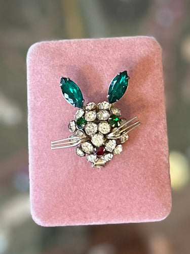 Vintage 1950s Unsigned Round Prong Set Clear, Emerald Green, & Red Rhinestones Dimensional Bunny with Whiskers Brooch Pin