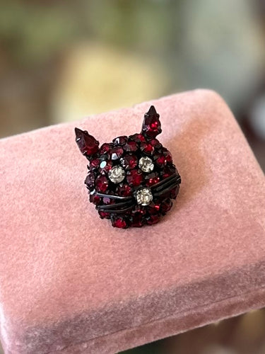 Vintage 1950s Signed WARNER Round Prong Set Ruby Red Glass Rhinestones Japanned Dimensional Cat Brooch Pin
