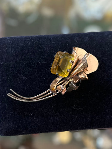 Vintage 1940s Signed BROOKRAFT Rose Gold Sterling Silver Faceted Yellow Topaz Glass Rhinestone Statement Brooch