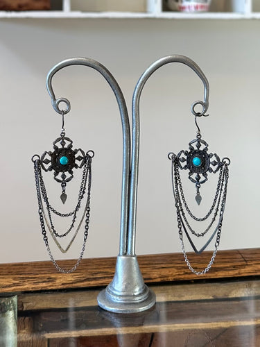 Vintage Bohemian Chandelier Silver Plated & Genuine Turquoise Statement Dangle Earrings