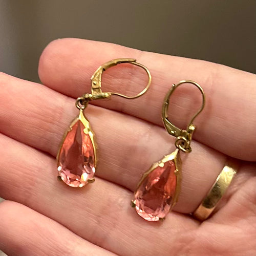 Vintage Germany K&L Gold Tone & Pink Glass Teardrop Earrings