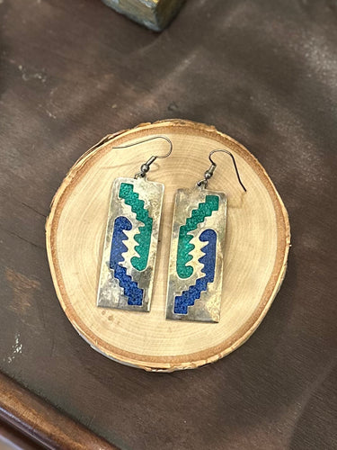 Vintage Signed ALPACA MEXICO Southwestern Silver Plated Blue & Green Mosaic Inlay Rectangular Dangle Drop Earrings