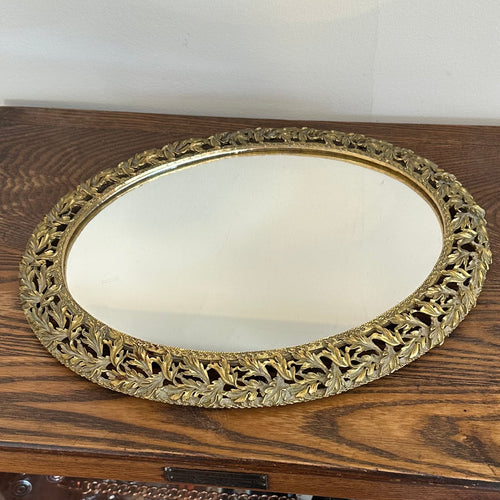 Vintage Midcentury Hollywood Regency Ornate Leaf Gold Tone Gilt Oval Vanity Mirror Tray