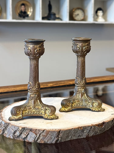 Pair of Vintage Ornate Gilt Metal Church Altar Candle Holders Religious 4.5”