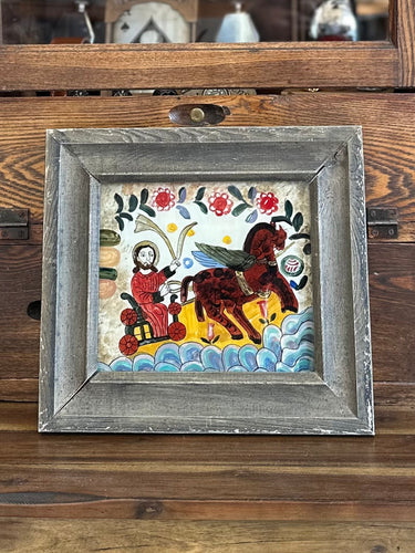 Vintage The Assumption of Elijah | Reverse Painting Framed Folk Art Romanian Eastern European Icon | 10.75" x 9.75" Frame