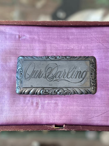 Antique Victorian Engraved Our Darling Metal Casket Plate Scroll Design Silver Tone 4x2 Mourning