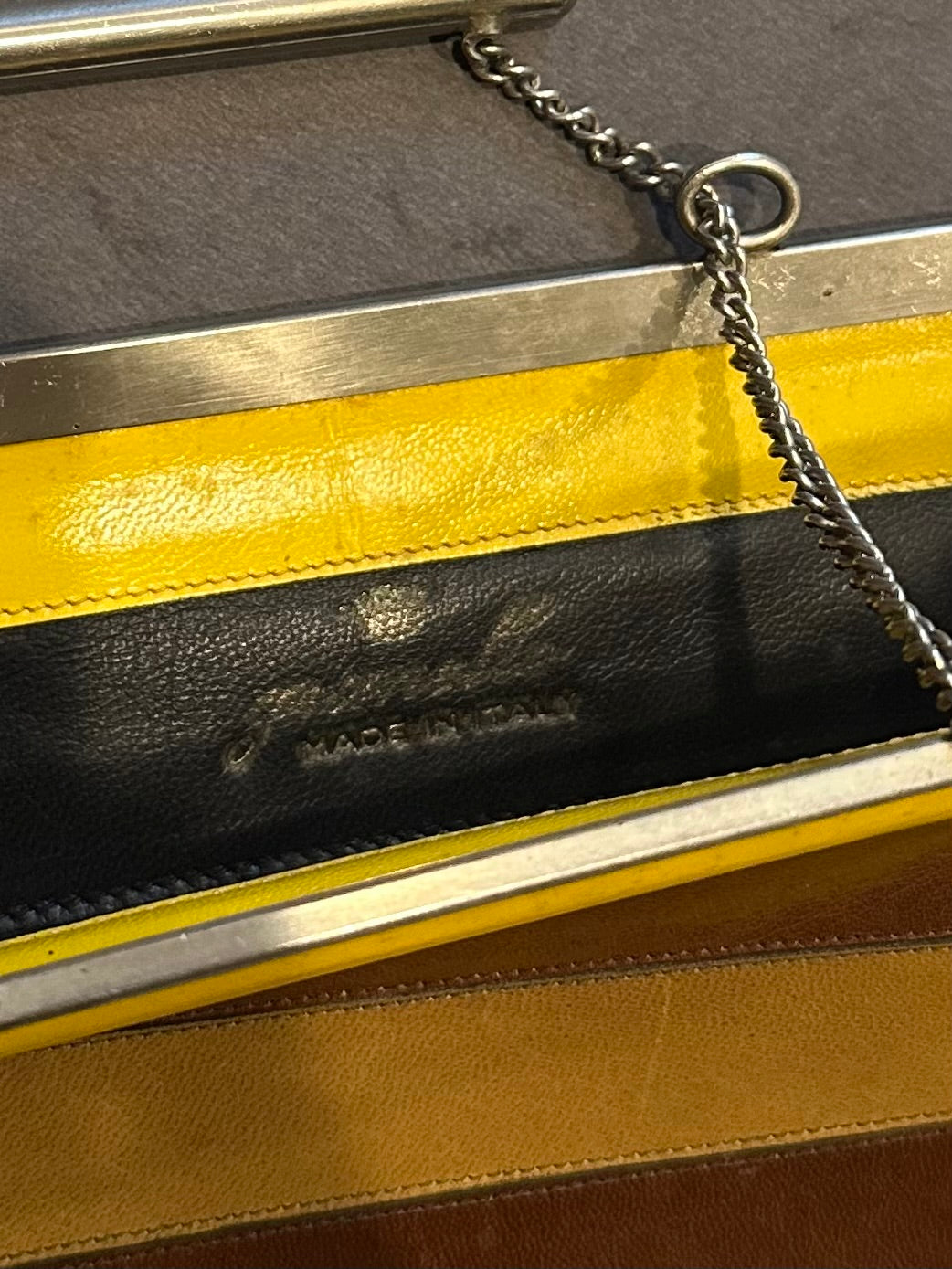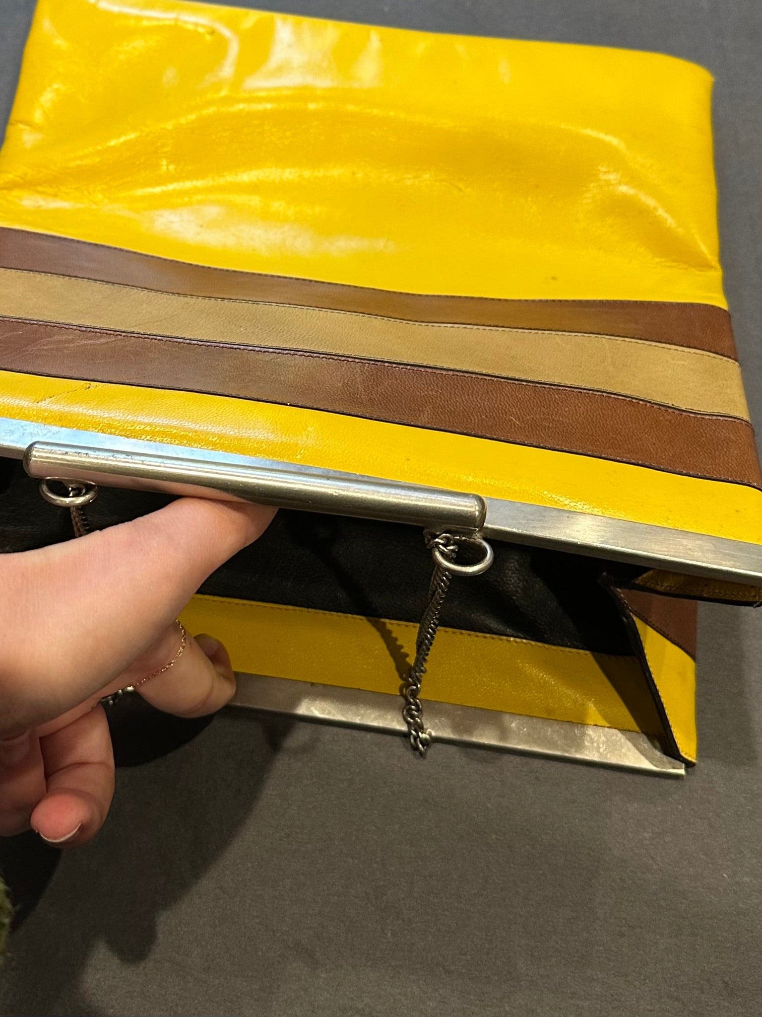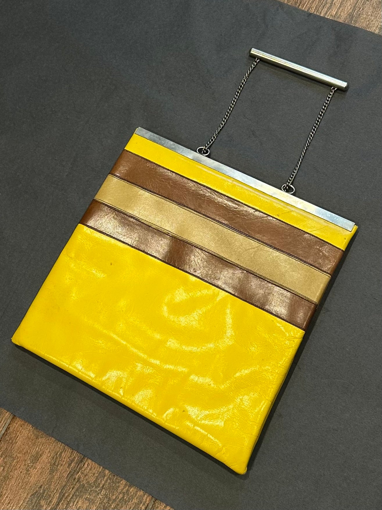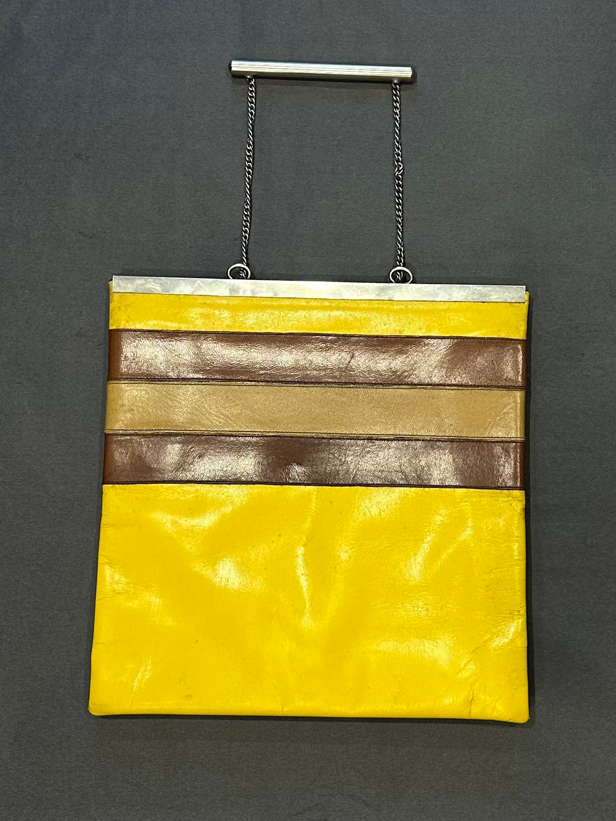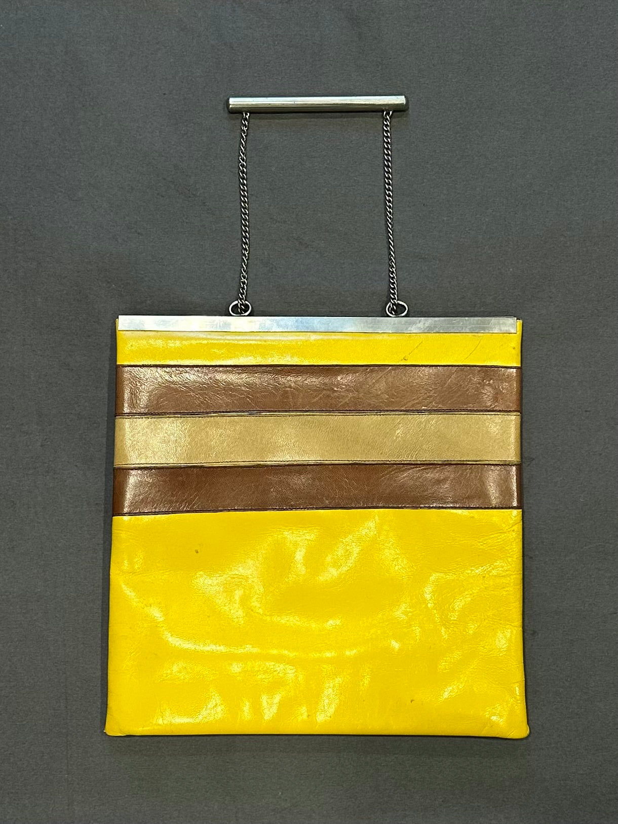 Vintage 1990s Granello Italy Yellow & Brown Striped Modernist Purse Silver Tone Bar Chain Handle