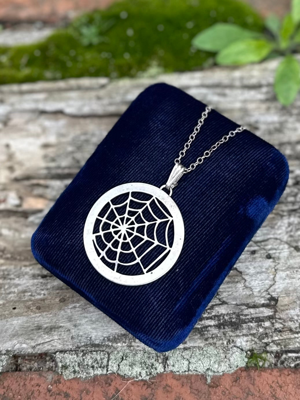 Vintage Signed AD Sterling Silver Spiderweb Web Pendant Necklace 17.5”