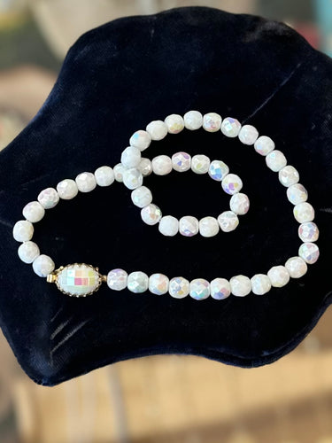 Vintage Midcentury 1950s 1960s Faceted Cut Glass White Aurora Borealis Beaded Necklace 15.5”