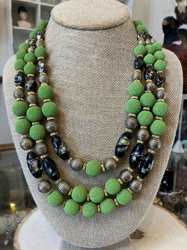 RARE Vintage HOBE '50s Tri-Strand Green Art Glass & Gold Tone Necklace Faience