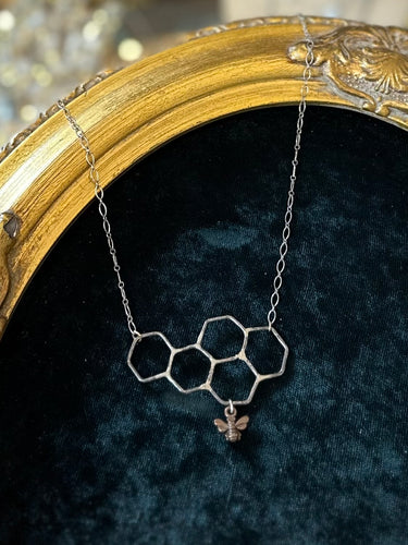 Sterling Silver & Copper Bumblebee Bee Honeycomb Pendant Necklace Queen Bee 20.25”
