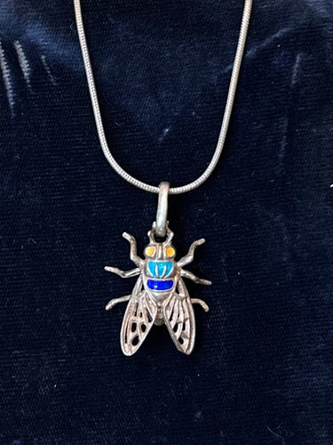 Vintage Italian 900 Silver & Enamel Fly Insect Pendant on Sterling Silver 925 Snake Chain 18.75”