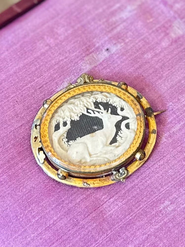 ANTIQUE Victorian Hand Carved Bone Stag Deer Tree Pictorial Landscape Gold Tone Gilt Metal Pinchbeck Brooch C-Clasp