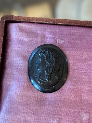 Antique Carved Whitby Jet Cameo Pin Victorian Mourning Brooch Facing Left