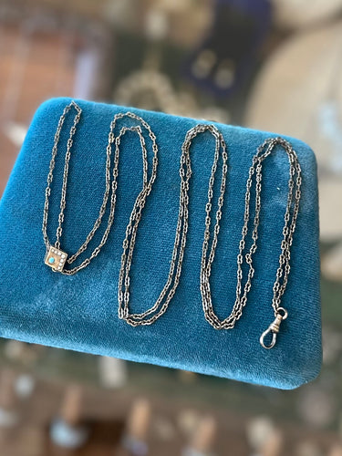 Antique Victorian Opal Seed Pearl Gold Filled Fob Slide Watch Chain Necklace 50”